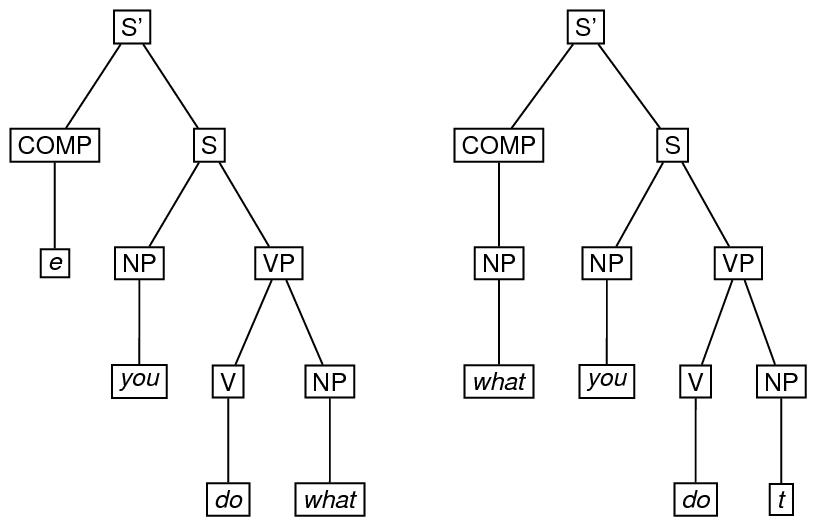 A derivation in a generative grammar is often thought of as a set of trees. To encode such a derivation, one may use the forest element, in which the trees may be marked up using the tree, the eTree, or the triangle element. The type attribute may be used to specify what kind of derivation it is. Here is an example of a two-tree forest, involving application of the ‘wh-movement’ transformation in the derivation of what you do (as in this is what you do) from the underlying you do what. 74