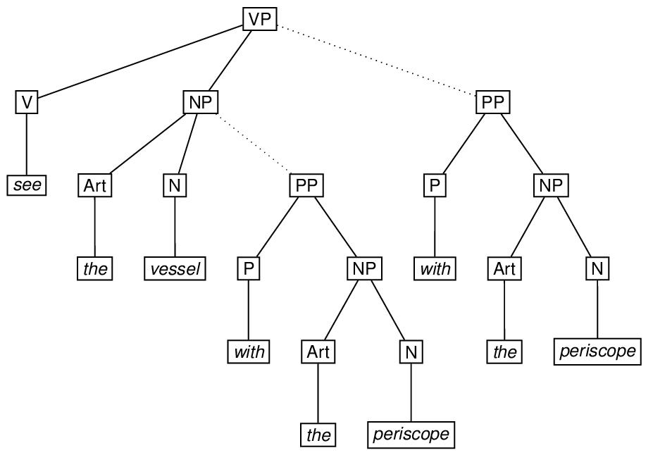 Ambiguity involving alternative tree structures associated with the same terminal sequence can be encoded relatively conveniently using a combination of the exclude and copyOf attributes described in sections 17.8 Alternation and 17.6 Identical Elements and Virtual Copies. In the simplest case, an eTree may be part of the content of exactly one of two different eTree elements. To mark it up, the embedded eTree may be fully specified within one of the embedding eTree elements to which it may belong, and a virtual copy, specified by the copyOf attribute, may appear on the other. In addition, each of the embedded elements in question is specified as excluding the other, using the exclude attribute. To illustrate, consider the English phrase see the vessel with the periscope, which may be considered to be structurally ambiguous, depending on whether the phrase with the periscope is a modifier of the phrase the vessel or a modifier of the phrase see the vessel. This ambiguity is indicated in the sketch of the ambiguous tree by means of the dotted-line arcs. The markup using the copyOf and exclude attributes follows the sketch.
